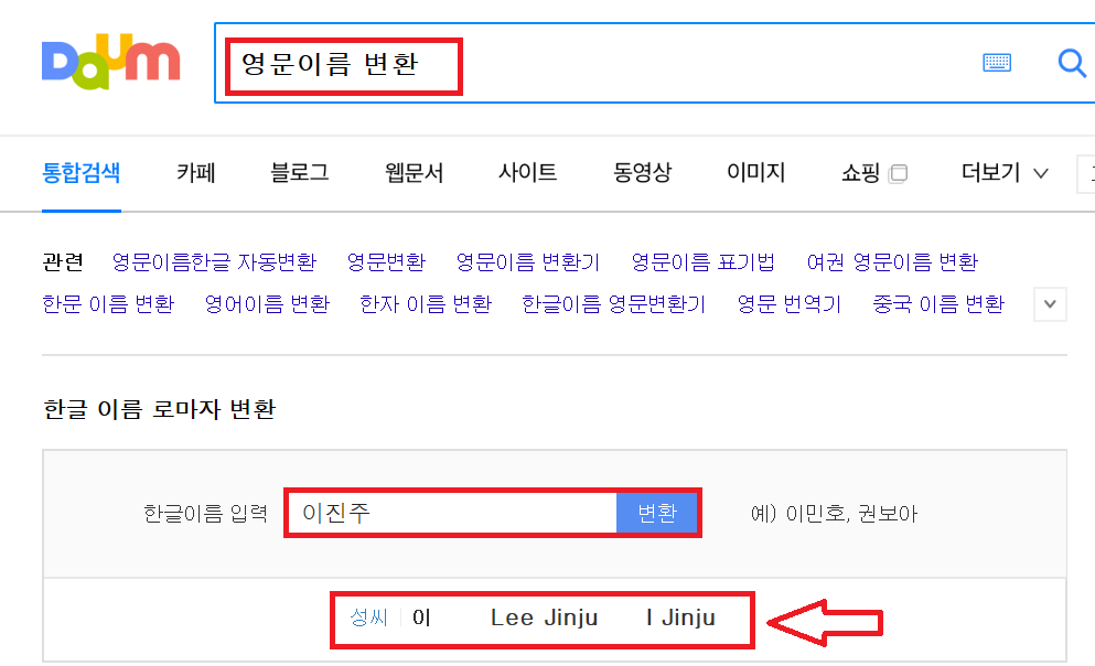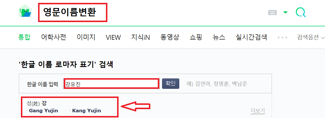 또다른 방법으로는 이력서나 해외사이트 회원가입시 한글 이름을 영문이름 변환할 때 쉽게 알려주는