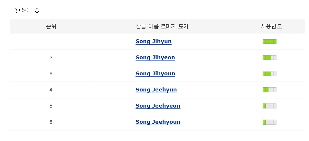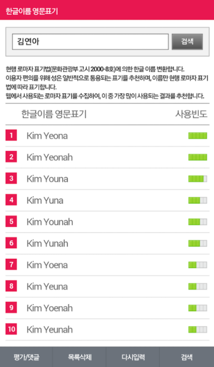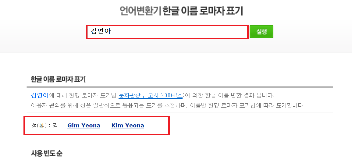 영문으로 변환하며 한글이름 영문표기법 중 사용빈도를 확인하여 많이 사용된 순서대로 보여줍니다.