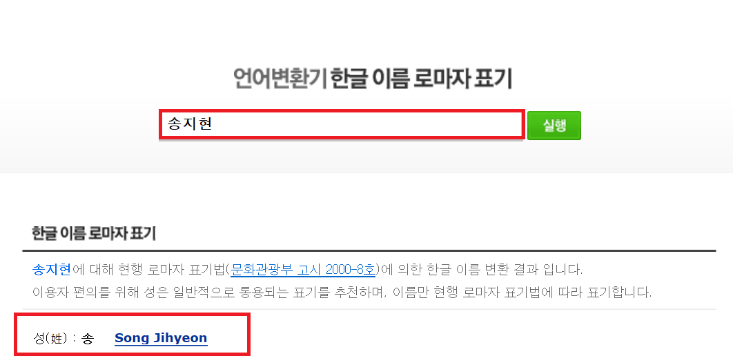 네이버랩의 언어변환기 한글이름 로마자 표기를 이용하면 현행 로마자 표기법에 따라 한글